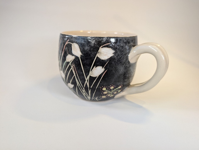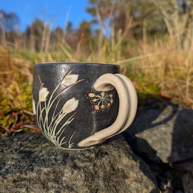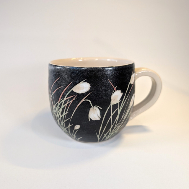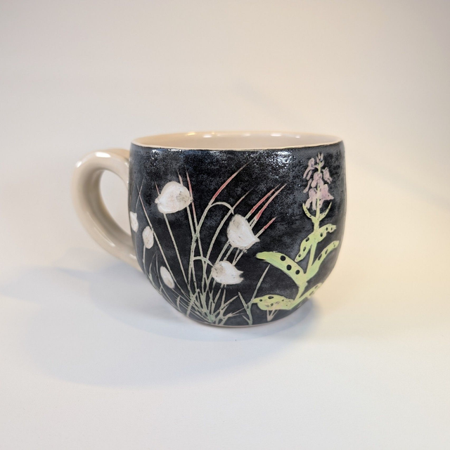 Large handmade stoneware mug, decorated with bog cotton. Each mug is unique, with variations including other plants such as sundew, butterwort, bog asphodel and orchids.
