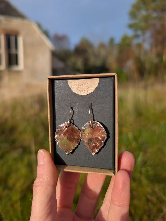 Downy birch leaf raku earrings. These earrings have been handmade and raku fired to give an iridescent reflective surface with metallic copper and green tones. The back of the earrings have been decorated in a classic white raku crackle.