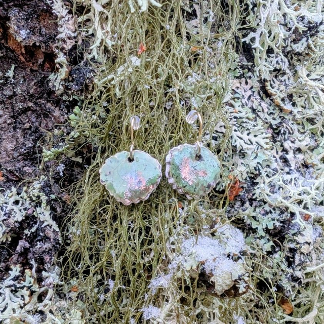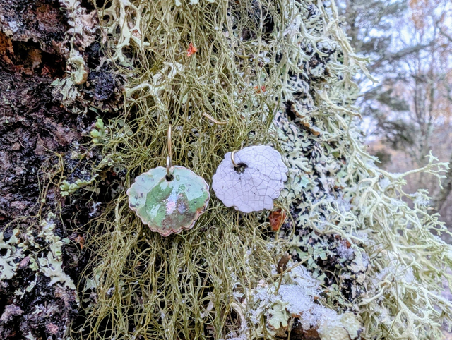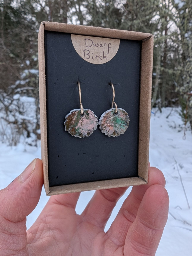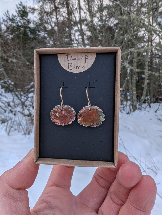 Dwarf birch - Betula nana - is a rare 'wee' tree found in the mountains of Scotland, a once abundant shrub of our arctic-alpine mountain woodlands. These earrings are hand made from imprints of their beautiful tiny cloud shaped leaves, raku fired to release beautiful copper hues, with a classic white crackle glaze on the reverse.