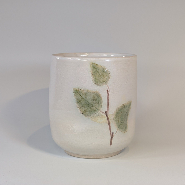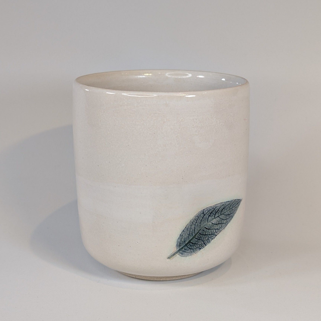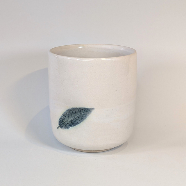 Mugs are hand thrown, leaves are pressed into the surface, the cups are pinch shaped and turned. These are then bisque fired, and a variety of coloured glazes hand painted into the leaf imprints before a final glaze firing.