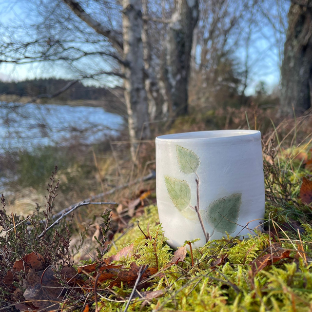 Stoneware pinch cups decorated with leaf imprints. Each pinch cup is unique, with intricate imprints from a variety of tree species. These pinch cups feel soft and tactile in the hand, offering a quiet moment of contemplation with your favourite brew.